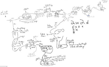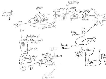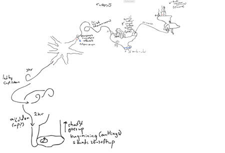 Gregory the bald returned, with no memory of being gone. No one remembers him being there. Mattias, undeterred by the Antling Soldier's doubt, continued to pitch his restorative cure-all (beaver perfume.) An Antling Diplomat was summoned to discuss and Hulios' bellows were used to atomize the perfume and send it whafting up into the cave above. The Antling Diplomat was quite pleased with the scent. A trade was brokered: the perfume, for a Glow Beetle light. But the players were warned, if not fed, the beetle would get aggressive. The Diplomat asked if the players were saved and they affirmed that they were, he went on to allude to the Antling being determined to seek out hell, but the conversation was not very productive. The party was encouraged to move on and not come back. They did as asked.At the Captain's behest, they backtracked to where he was found, and took an alternate route. Hours later while traveling down a fairly level tunnel the PCs felt a wind at their back, almost pulling them down the tunnel ahead. They pressed on and found before them a massive chasm of reflective sharp faced and faceted silver stone. From the far side came the sounds of human civilization, the chattering of a strange but human tounge, and the cacophony of daily tasks. Leading down the chasm wall before them was a monolithic staircase of countless switchbacks. After hours of descent, an ancient stone bridge, carved in the same style as the stairs was found, seemingly spanning the gap. The bridge was crossed, and the town sounds grew louder. Szabos was wary as usual. He spoke of a Half Real village, only existing when perceived. The party heeded his advice and slinked around the outside of the cave avoiding the unseen village.After a few more hours of caving, the party came, somewhat abruptly, upon another Ghoul Captain, and his host of feral soldiers, holed up at the ready in a smallish cave. The party and Captain Szabos spoke with the captain, who was identified as Captain Kolkbläser Von Der Pahu. He spoke down to the injured Szabos, who seemed to be aware of Von Der Pahu's true purpose. Szabos, the shattered man he was, admitted to failing at his task, though never specifying what it was. Von Der Pahu was not kind and insisted Szabos return to his "papa" at once. Defeated and dismayed, Captain Szabos urged the party to continue forward to Baron Rhotan's fortress.Hours later the tunnels and caves changed to narrow passages between marble boulders of varying sizes. The way forward led straight down an ungulating waterfall of marble boulders. The climb looked difficult in the darkness, but just before descending, the echoes of a weary patrician voice rasping in a dialect, similar to that of Captain Szabos, made it's way up through the darkness, followed soon by guttural groaning responses. Captain Szabos was dismayed further by this discovery, which he identified as a Ghoul Noble and their court, in transit for some reason. Undeterred the party planned their descent, but took no care to stay quiet. Just beyond the halfway point of their climb, a light was lit below revealing a Ghoulish aristocrat and a his feral court. Communication was established, and an agreement was made. The feral ghouls would leave, to allow them to descend, but the party would not linger or bother the Noble. The plan worked well, except Gregory missed a dyno on the way down, fell 20ft, and broke a rib. The ghoulish court was clearly disappointed he survived the fall.After a few more hours of travel through the boulders, the party came upon a cave. Within, a floppy pale arm, bigger than a man, extended from within pile of smaller boudlers that made up the northern wall of the cave. Gregory, seeking food, attempted to remove a finger, but in doing so, found himself trapped beaneath the now clearly livinng hand, not crushed, but overwhelmed by the almost fluid viscous flesh. A yet unseen face sticking out higher up bellowed out threats. It's skin was loose and sagging, fluid like that of the arm. The giant threatened to eat them, but the party responded by offering meat. The giant was interested, but demanded once fed, that the party free him from the rockflow. The party agreed. But had no intentions of assisting. They saw an oppy. They climbed upon the boulders, and attempted to remove the giants arm with synchronous axe strikes. While they did succeed is causing great harm to the creature, they did not sever the arm. The giant flailed and screamed in pain, and in doing so disturbed the boulders. Unable to keep his feet Mattias fell and smashed his head. He survived, but was concussed. While he rested, the rest of the party finished removing the giants lame arm. They decided, after much debate not to kill the giant, or too linger here too long, and instead feasted upon his armflesh which was a bothersome amalgamation of connective tissue and skin like melting cheese. As Mattias regained conciousness, The Rapture took him. His body went stuff and silent, but in his mind he found himself standing stop a capsized boat on a starless inky sea. Deep below in the water strange lights coalesced. Across the wreckage stood shadow forms of his beloved mates, Gregory and Hulios. The two figures set upon him with weapons drawn. He was able to fend off their attacks, dispatching shadow Hulios, but when he attempted to seize Shadow Gregory by the throat, he was outmatched and heaved into the cold dark water. Back in the Veins, Mattias awoke screaming, then bellowed out in cackling laughter. The Rapture had taken him. What happened next is beyond his control.